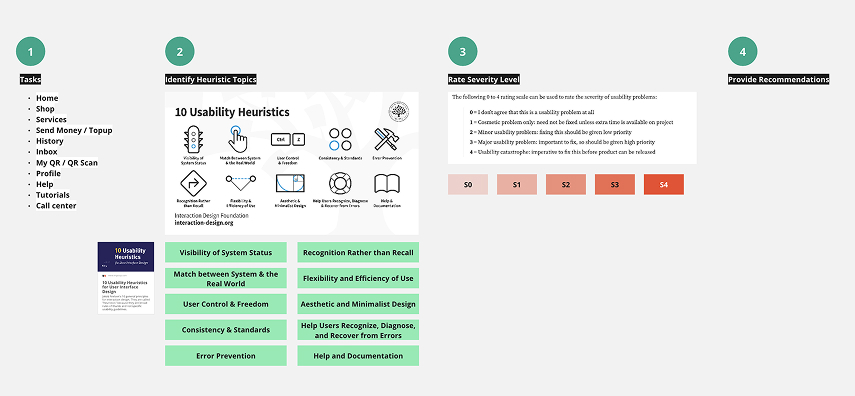 In this project, I assigned a total of 3 people (2 UX researchers, including myself, and 1 UX designer) to go through the application individually. Each person listed out the issues they found on a Miro board - using the Nielsen's 10 Heuristics and Severity Levels as a guideline.