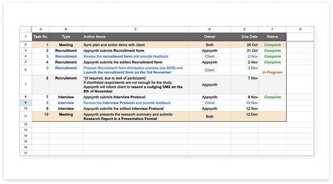 Timeline and Action Items Sheet is used to synchronize tasks between researcher and clients as the project requires client support on the recruitment process.
